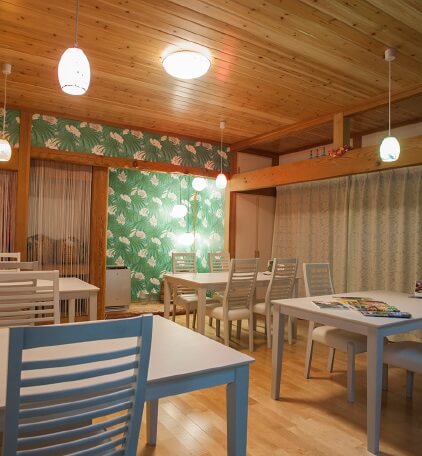 オープンテラスに出ることができて、オーシャンビューを満喫できます。お子様連れのお客様はキッズルームとしてお使い頂けるように、絵本や積み木、おままごと道具なども用意しております。また、多目的ルームは、週に2日、オーナーがフラダンス教室を開いております。